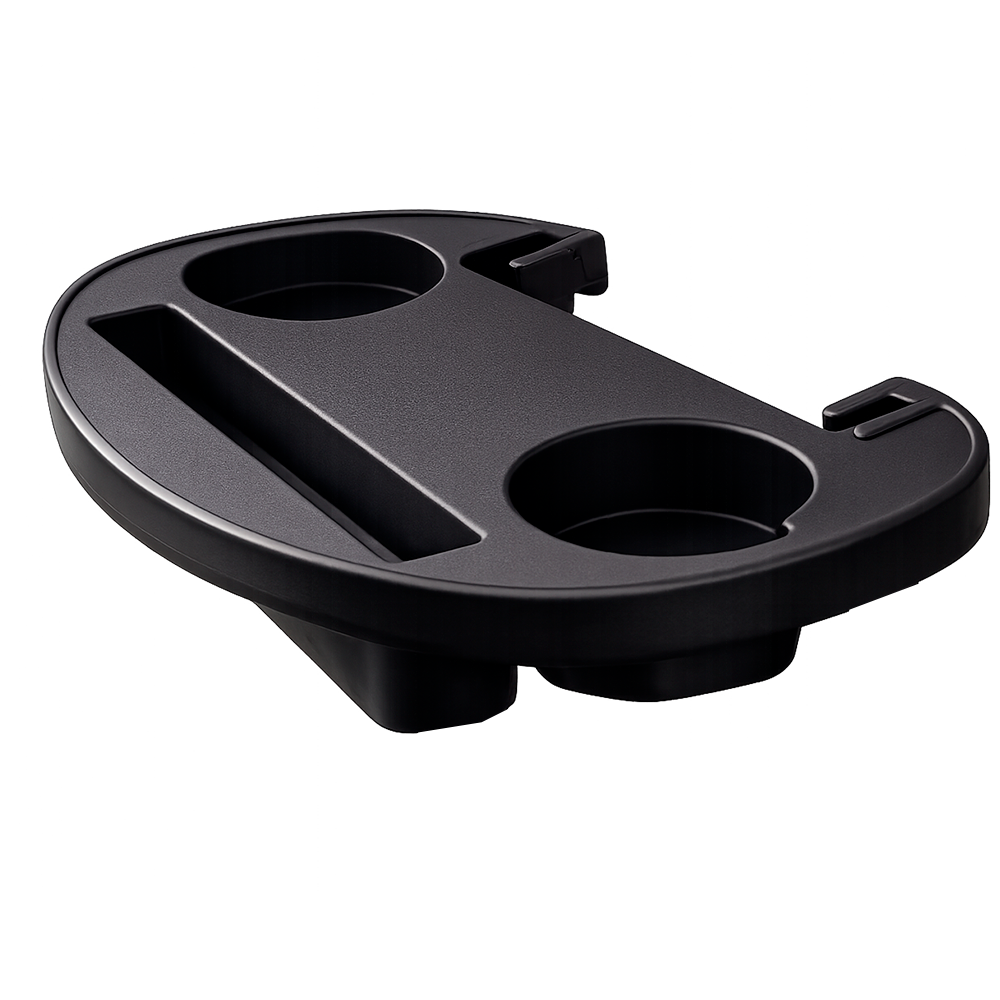 Porta-objetos removível com suporte para celular/tablet e espaço para bebidas.